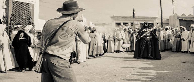 Don t bring a lightsaber to a gunfight - © Tony Leone Raiders of the Lost Ark Limited Edition 01/10 DIGITAL COLOR PHOTOGRAPHS 45 x 19 cm Printed on paper Fine Art - shipping in a tube with signature brand exquisite high quality. approved by Darth Vader and the artist. With certificate of auth...