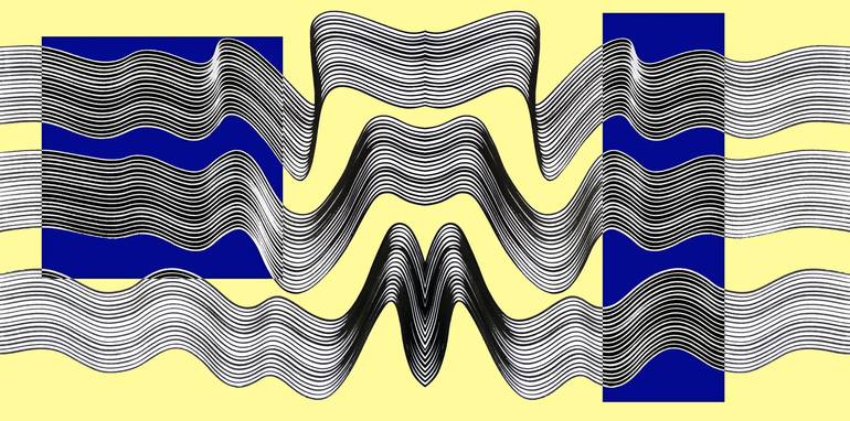 Black and white waves flowing across the artwork with blue abstract rectangular shapes adding a contrasting element and colour to the artwork. Vibrant Archival ink print on Epson matte finish Canvas. Canvas print with museum finish archival inks lasting more than 30 years in vibrancy and colour satu...