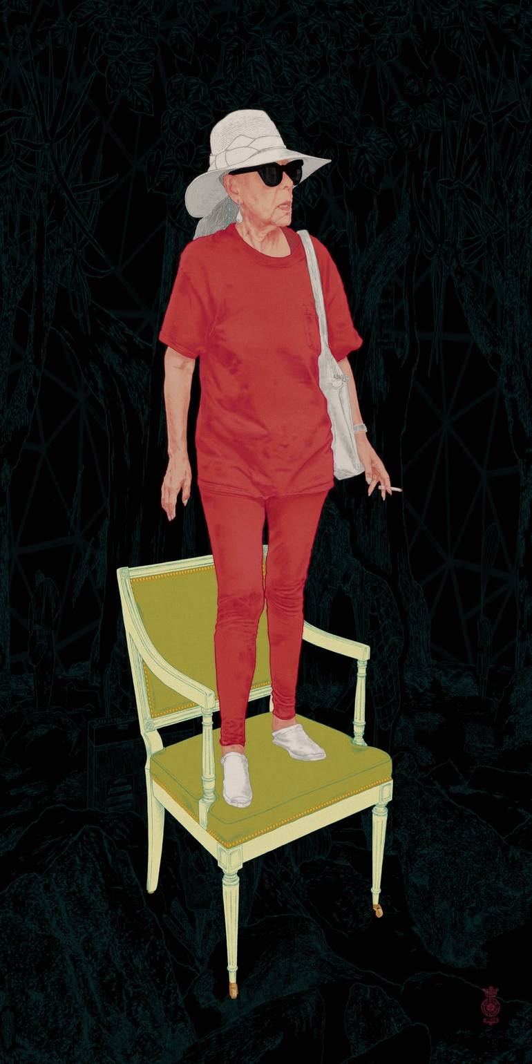 A portrait of an elegant mature lady dressed for the summer, in red outfit and white hat, smoking a cigarette. The prints are made on high quality fine art paper. The print is invisibly bonded behind a panel of museum grade acrylic glass, in a process called face-mounting.
