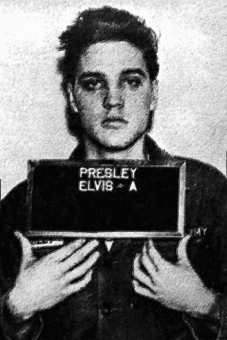 Pop art comes in many forms. I consider this one of them. You'll find here an ACTUAL, REAL mugshot of Elvis Presley. Elvis Presley was arrested in the mid-1950s for a speeding violation whereby he was cited for doing over 70 mph en route to a performance... remastered and enhanced (in an "on purpose...