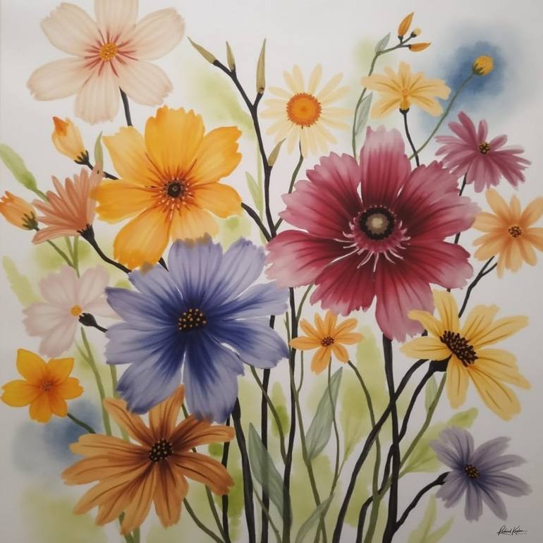 A collection of vibrant flowers in various colors, including orange, purple, and pink, is depicted against a light background. The delicate blossoms appear to be gently swaying with thin, dark stems connecting them.