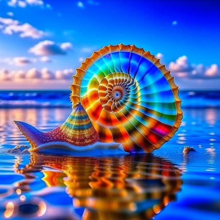 Fantastic Nautilus is a radiant celebration of nature’s geometry and color. The iconic spiral shell, reimagined in a dazzling spectrum of rainbow hues, reflects against the calm shoreline under a vivid sky. Its luminous curves symbolize infinity, growth, and transformation, while the vibrant palette...