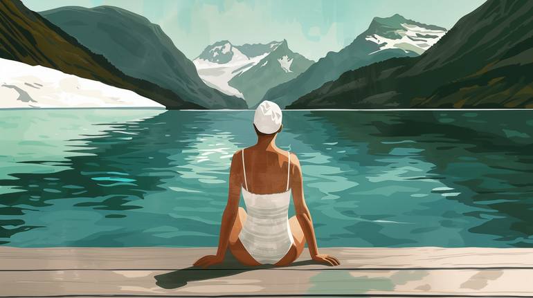 The Swiss mountain lakes are clear and cold, swimming in them is a special pleasure. But not too long, snow and ice are not far away. The snow-covered mountains seem to continue even in the white swimsuit and swimming cap. That's why this Swiss swimmer takes a break in the sun on the jetty. She enjo...