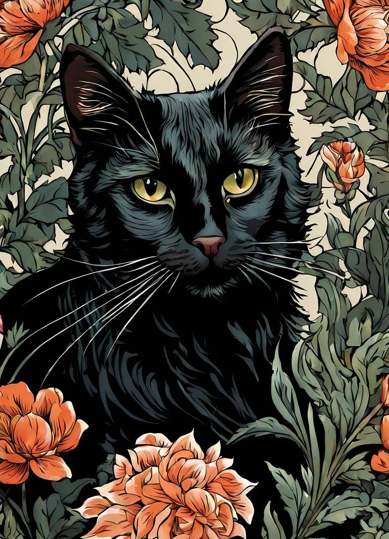 Find the perfect piece for your living space today. Made with museum-grade paper. Matte finish. In an era caught betwixt flames and art, A muse arose, captivating every heart. With strokes of elegance upon the canvas vast, A Floral Black Cat of the highest class. William Morris, the master's keen...