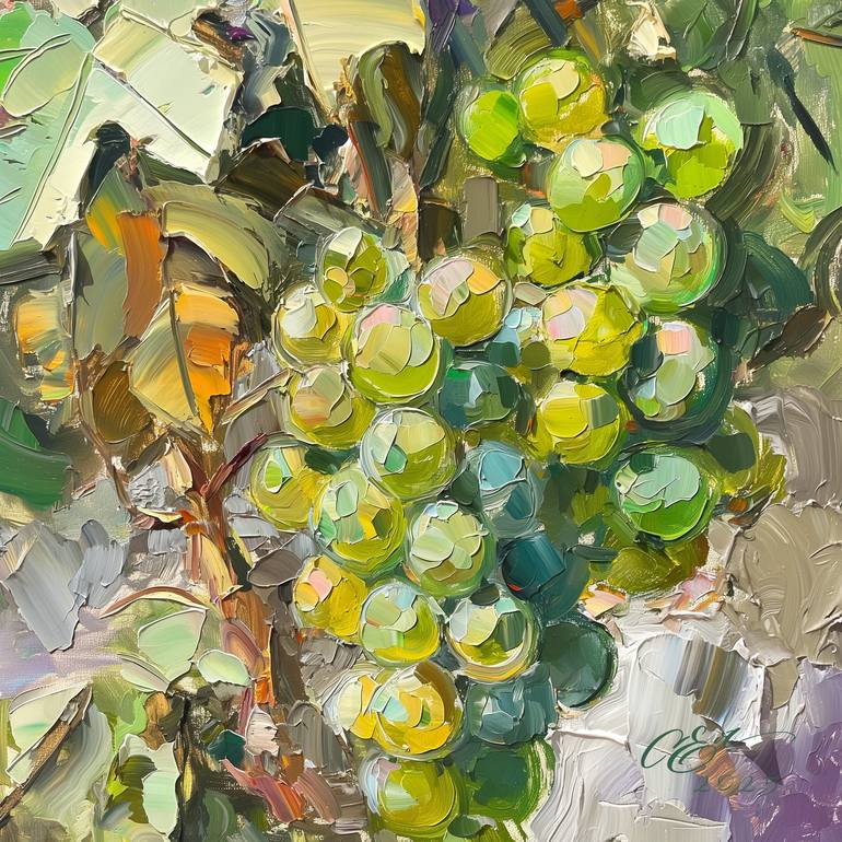 "Fresh Essence" captures the luminous beauty of sunlit green grapes, bathed in soft, golden light. The vibrant brushstrokes and layered textures bring the scene to life, celebrating nature's fresh, rejuvenating energy. Each grape glows with a delicate balance of greens and yellows, evoking a sense o...