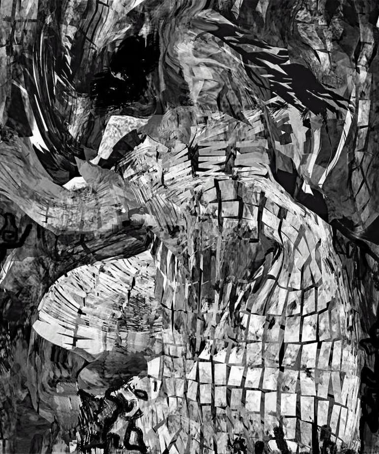 A humanly shaped splintering of white particles, set in an environment of a scattering of black ones, sends a message to bewildered humanity in distress. The work depicts the Earth Mother, Gaia, turned into a fury by humans’ technological hybris and unlimited egocentrism. The work is printed on Ho...