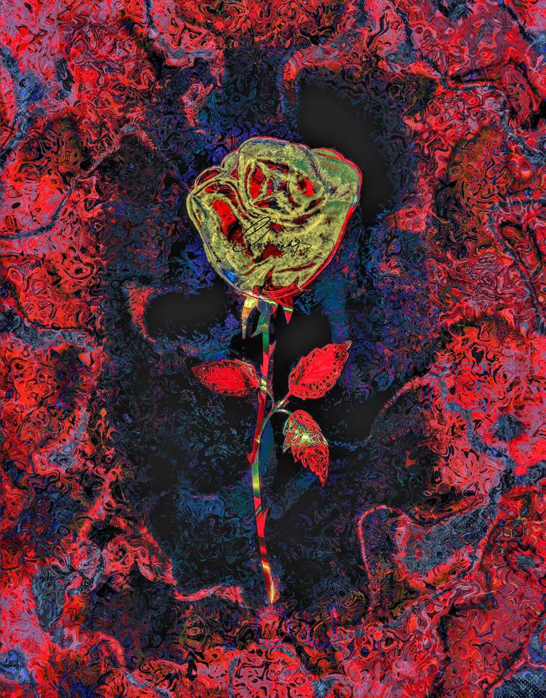 This dynamic and vibrant digital artwork captures the essence of gratitude through its central theme—an intricate rose that symbolizes appreciation. The composition features a bold and abstract background of deep reds, greens, and whites, visually portraying an energetic expression of life and conne...