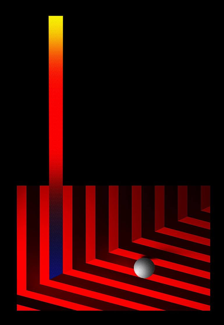 Three dimensional render of small red sphere rolling over geometric pattern Sale as a Limited Edition print of 25 Giclee fine art Prints on Metal H 86 x W 59cm $ 1100 + shipping. All limited edition Metal prints are accompanied by a signed and numbered Certificate of Authenticity by the artist.
