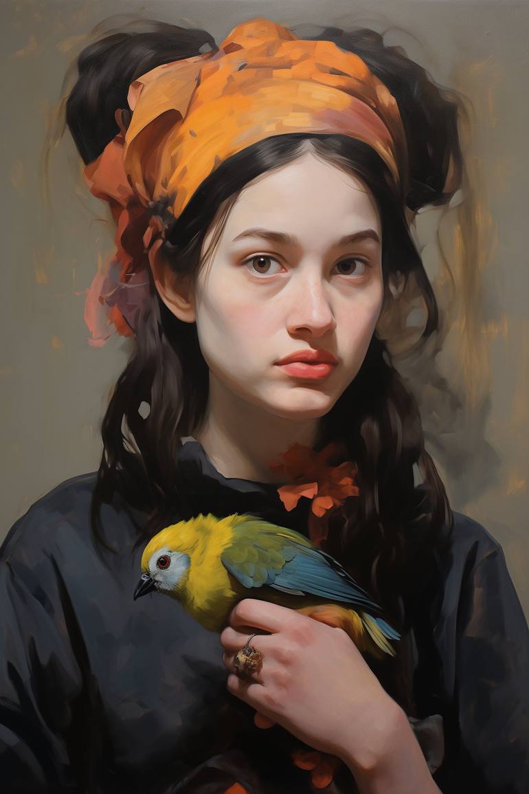 In the picture, the artist masterfully combines bright shades to convey emotions and symbols. On a gray-beige background, a girl with a bright bird is depicted. She enjoys the moment of interaction with the parrot. Her attentive gaze is directed directly at the viewer, as if inviting bright colors a...