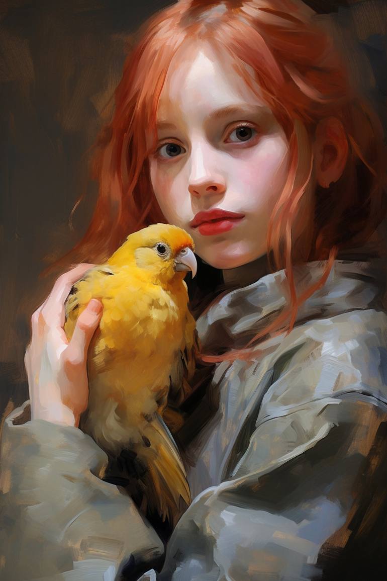This painting depicts a scene of tenderness between a red-haired girl and her path with a parrot. A girl with a slight sparkle in her eyes gently presses the bird to her chest, creating the impression of tenderness and care. The girl's red hair frames her face, and her bright lips add freshness to h...