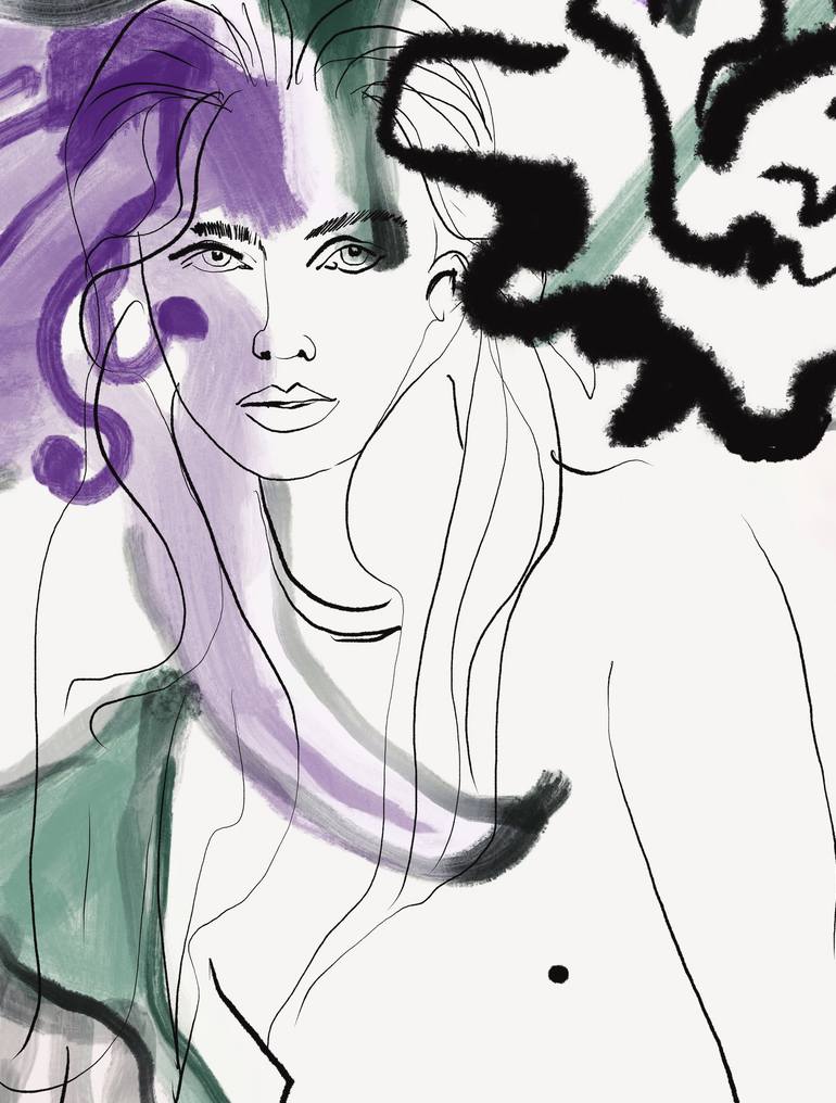 This unique artwork, "Goddesses No.14," is a captivating digital drawing, a beautiful figurative piece with elements of surrealism and contemporary illustration. The portrait of a woman is brought to life with ink, showcasing a blend of green, black, violet, purple, and white, accented with floral d...