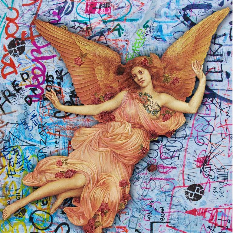 Graffiti background of a classic piece, enhanced and hand painted. 1 of 2.Two Angels during 14th century by North Italian Painter. Original from The MET Museum. Digitally enhanced by rawpixel. angel,antique,art,artwork,blessing,creative commons,creative commons 0,fresco,high resolution,holy,italian ...