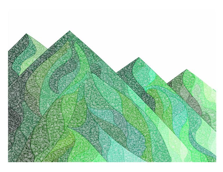 Intricate layers of intertwined patterns generate a tranquil feeling. Delicate swirls of various shades of green create an elaborate representation of mountainous landscapes. Each layer transports viewers into a space where nature blends with abstraction, challenging perceptions of form and proporti...