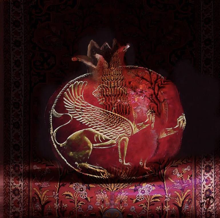 This artwork blends the cultural symbolism of the pomegranate with the mythical figure of the winged lion, representing protection and abundance. It merges ancient heritage with contemporary expression, inviting viewers to reflect on the enduring power of symbols in our lives.