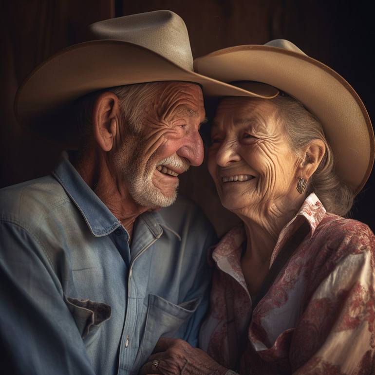 The couple's age suggests a lifetime of shared experiences, and their mutual affection is evident in the way they gaze at each other. There may be a warmth and tenderness in their eyes, reflecting the deep connection they have developed over the years. Their smiles are bright and genuine, expressing...