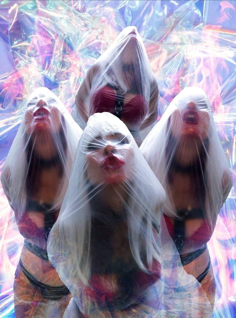 Photography and photomanipulation in color from 2021. Spirits of the dead or ghosts are emerging from holographic disco hell, crystal ocean or ultraviolet electric storm. Are they the same person? Are they multiplying like a hurt and traumatized person in a dissociative or fugue state? Are they call...