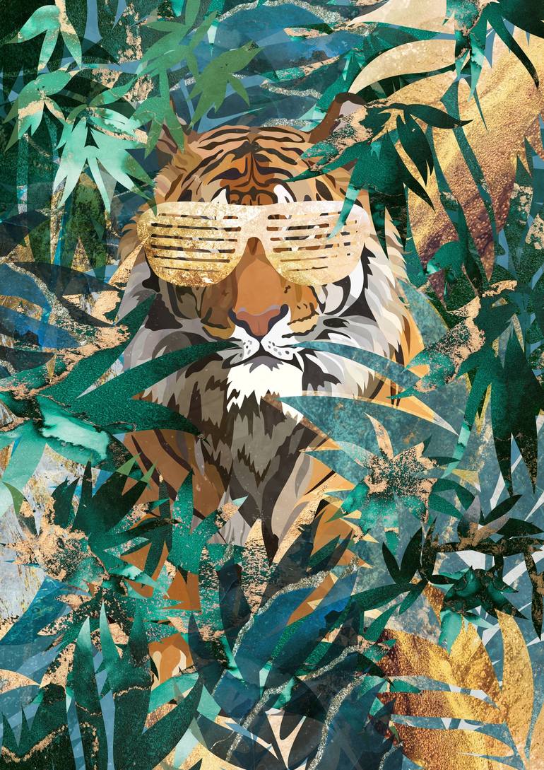A mixed media digital illustration by Sarah Manovski of a jungle scene featuring a tiger with golden highlights. Part of the GLAMIMALS collection. Framed in a rose gold copper frame with unbreakable plexi glass. Framed Print is exclusive to Saatchi.