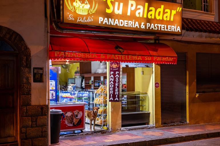 That night I was walking around a small town in Ecuador, it was a real dog hunt. They are very fond of dogs here and let them into buses, taxis and shops. These animals are very friendly and never attack people. This dog obviously came to buy himself a hot dog