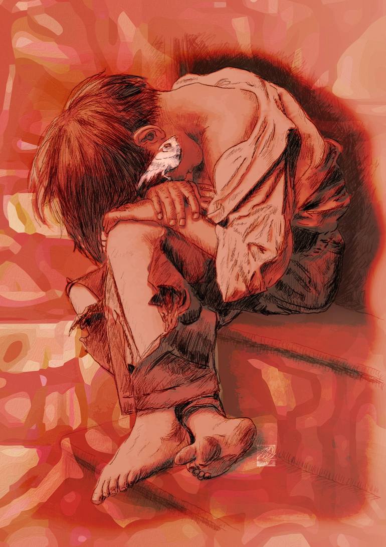 Children and bird, conceptual. Pencil drawing and mix of digital painting. Figurative style, modern illustration.