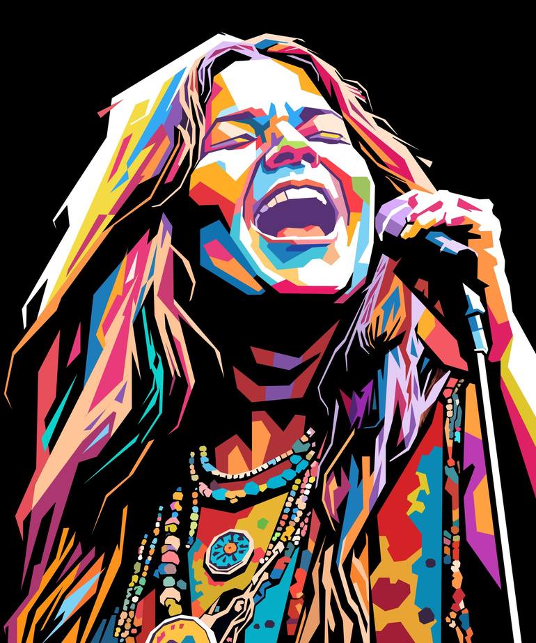 Janis Joplin the legend musician in wpap art style, colorful pop art style
