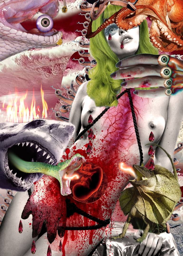 Digital collage in surreal manner. The first elaborate I ever made. Skinny, heroin chic model in the throws of dangerous and predatory animals as a metaphor of her fears, secret desires and fantasies.