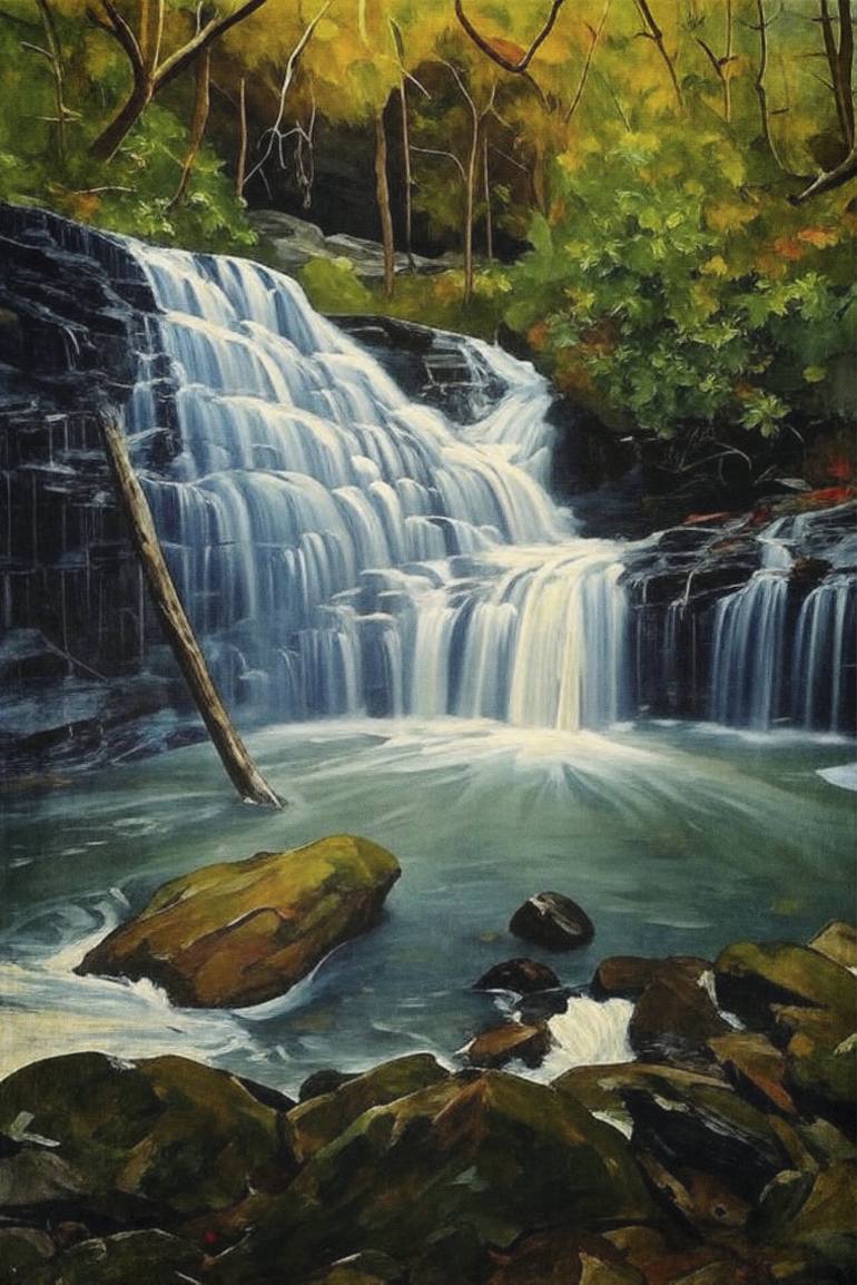 A serene waterfall cascades over rock formations surrounded by lush greenery, creating a tranquil scene. The water's gentle flow forms a pool at the base with rocks scattered around, adding to the natural beauty. This is Lower Jack Rock Falls, in Tennessee, based on a photograph I took.