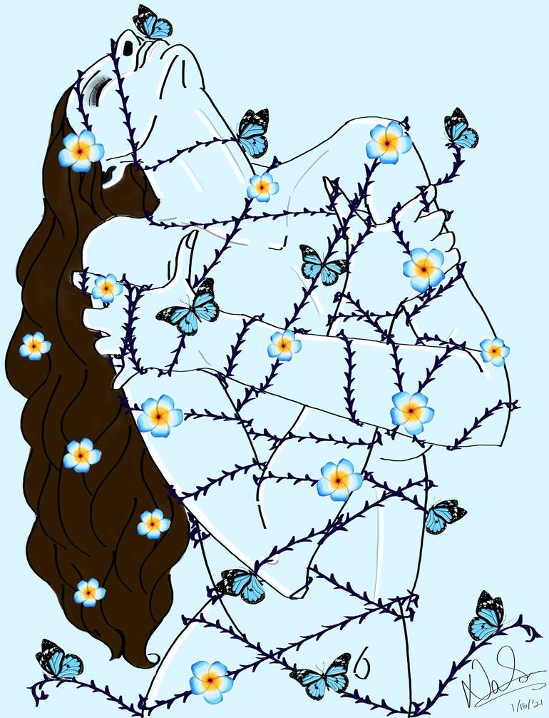 Through my studies in figure drawing, I explored my ideas and deepened the meaning behind their gestures. The thorns portray hurt and frustration. In contrast, the blue theme, flowers and butterflies, represent calmness and peace. "We may feel pain and sadness, but love will always be there.' Thi...
