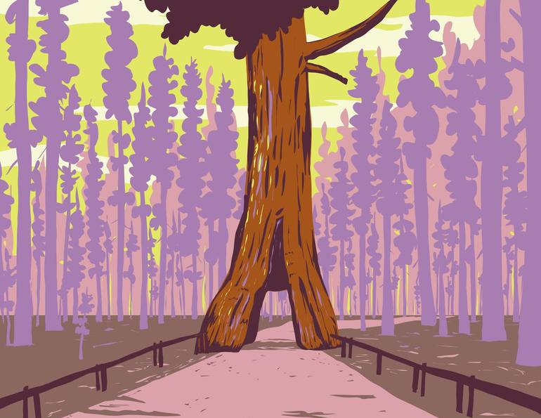 WPA poster art of Mariposa Grove of Giant Sequoias located in the southern part of Yosemite National Park, California United States done in works project administration or federal art project style.
