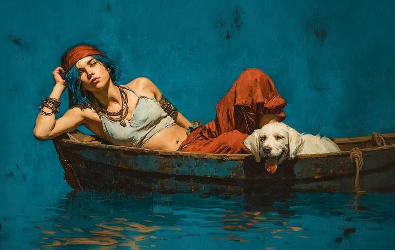 A young person with vibrant blue hair rests leisurely in a small boat, accompanied by a friendly white dog. The warm tones of their clothing contrast with the deep blue of the background and the water.