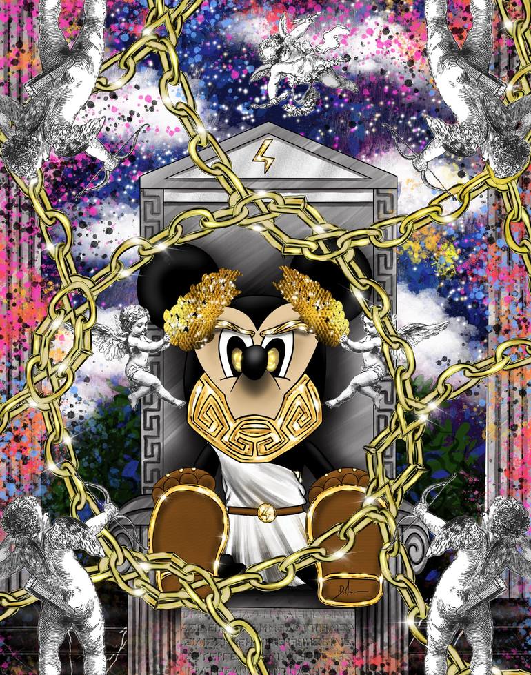 This painting, Zeus Mickey, is an interpretation of social ascension and its consequences, where Mickey becomes a divine figure. Here, he symbolizes the most inaccessible side of humanity—the one that rises to the top and begins to see itself as a deity. Sitting on the throne at the center of the co...