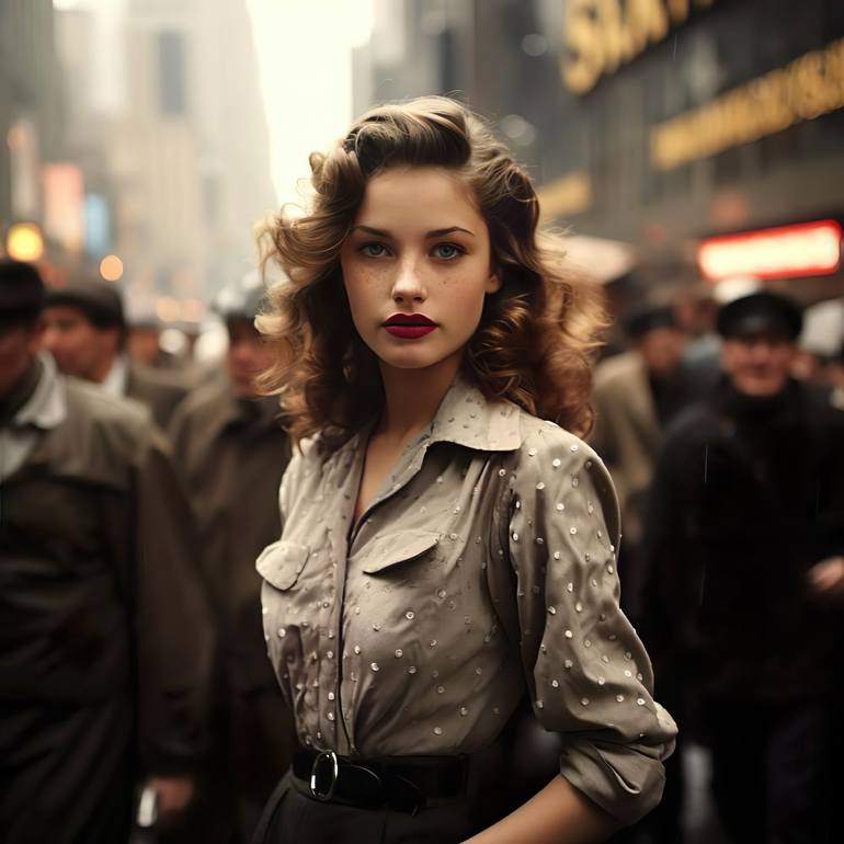 Title: Mimi: A Dreamer's Moment in the Spotlight Description: "Mimi" is a captivating 30x30 mixed media digital artwork that captures the essence of hope and ambition in the heart of a young aspiring actress. On her first day of auditions, Mimi's sequined top and bold red lips exude confidence, wh...