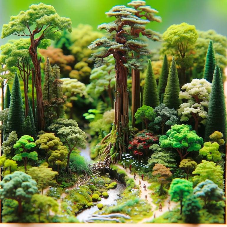 This miniature artwork presents a lush, nature-inspired forest scene with tall trees, vibrant greenery, and a small stream. The zoomed-out view captures a wide range of areas, showcasing more trees and greenery. Intricate details include tiny leaves, delicate flowers, and textured bark, adding to th...