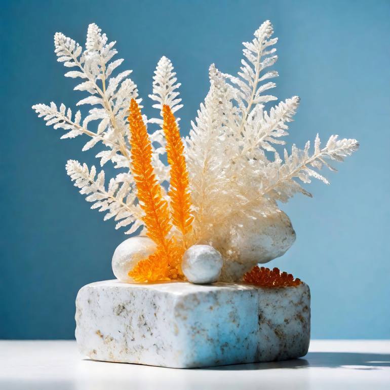 To decorate a minimalist home with muted hues, I thought of a modern, conceptual, oriental-style still life with white flowers, amber, white stone.