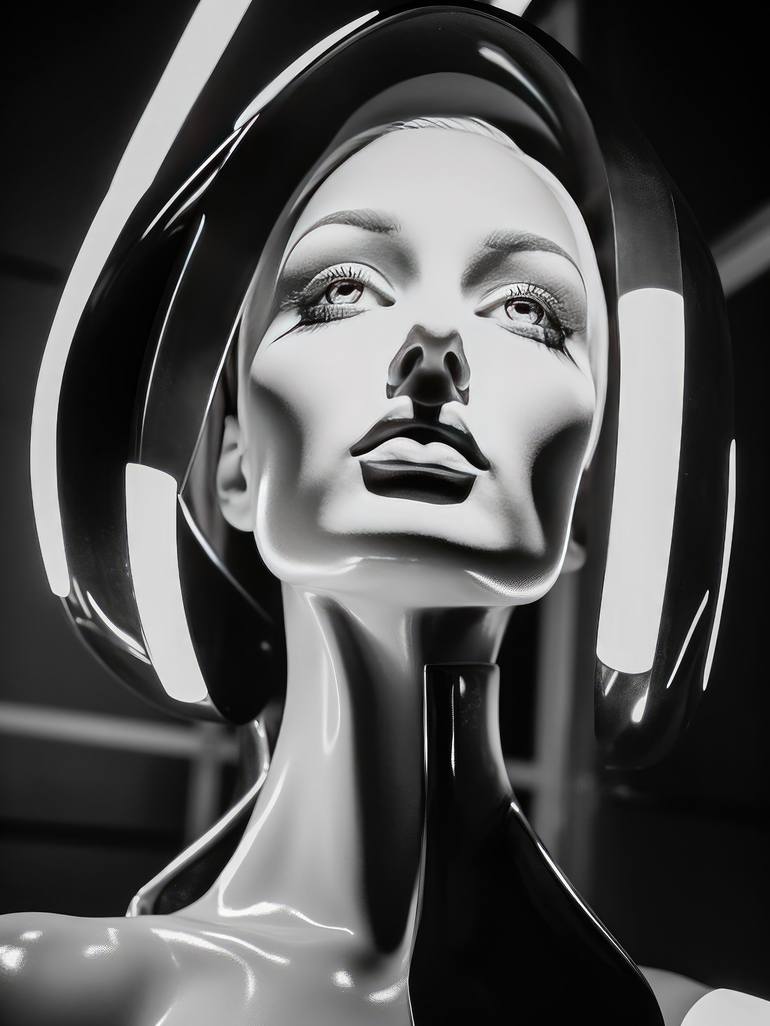 Experience the unseen world of androids, beyond the silver screen, through this captivating collection of female androids posing like photo models for the virtual black-and-white camera. Spanning several decades, from the thirties to the post-war era, the style features white lines suggesting mechan...