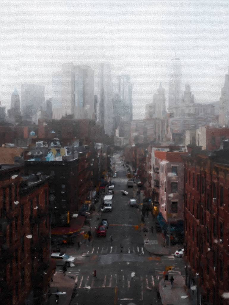One in a series of three Surreal, Manhattan City scenes. manhattan buildings, new york, ny, new york city, apartment, apartments, skyline, sky scrapers, city lights, modern, yellow, golden, surreal, modern, window, window, red, united states, american, us, americana, art deco, pre war, bright, color...