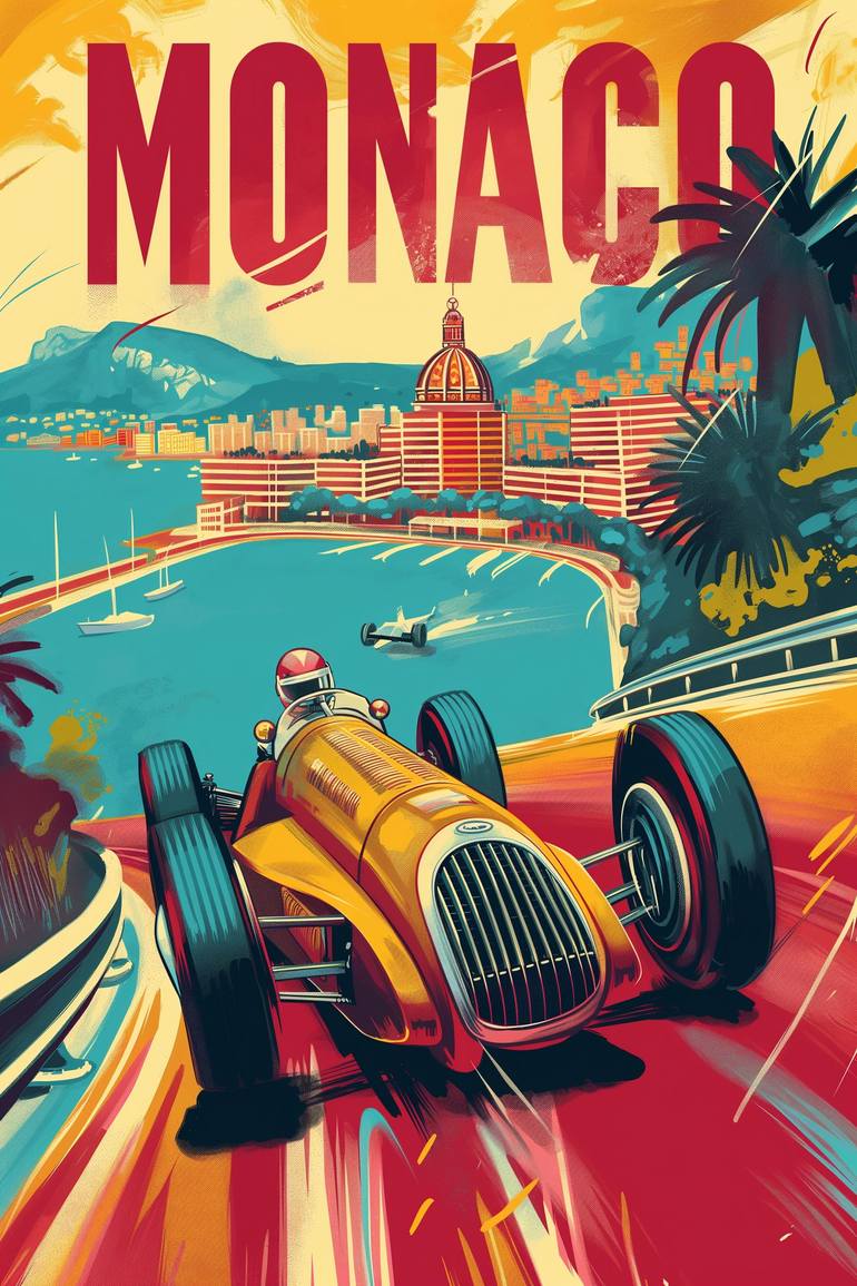 Experience the allure of vintage racing with this captivating Monaco Grand Prix racing poster. The artwork showcases a vibrant yellow race car hurtling down the picturesque streets of Monaco, with the stunning Mediterranean backdrop and iconic cityscape in view. The energetic composition and bold co...