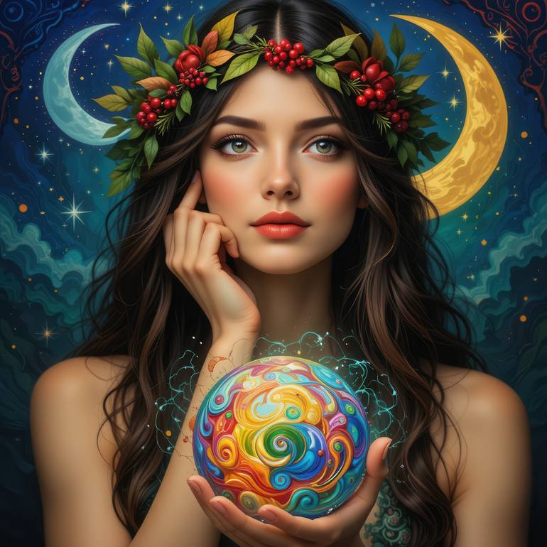 A woman adorned with a crown of leaves and berries holds a swirling, colorful orb. The background features two contrasting moons and a starry night sky, adding a mystical atmosphere.