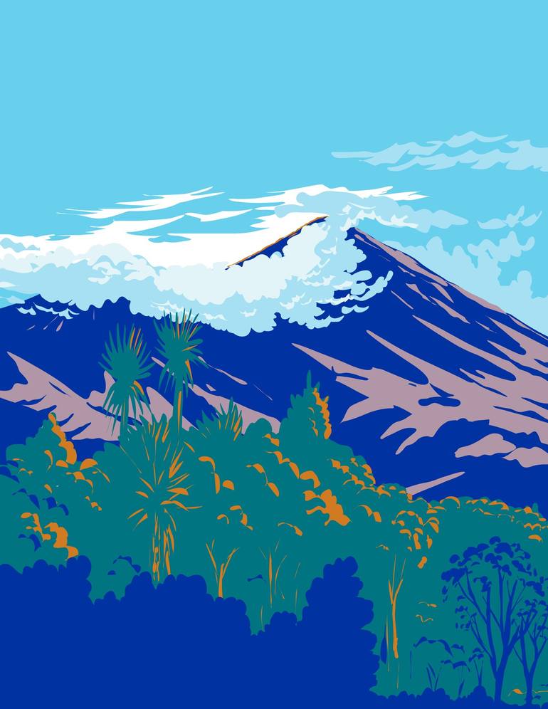 WPA poster art of Mount Taranaki and Fanthams Peak in Egmont National Park located in New Plymouth of the North Island of New Zealand done in works project administration or federal art project style.