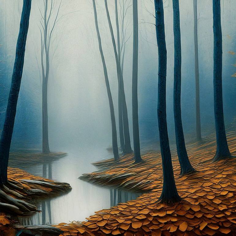 Introducing "Mystical Forest Blue Forest Pond Landscape" an enchanting artwork that invites you into a mystical blue forest where reality and dreams intertwine. This abstract canvas print captures the essence of a foggy woodland scene, with delicate leaves whispering secrets to the serene, light gra...