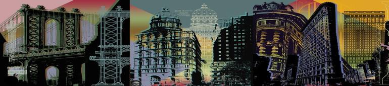 NYC panoramic architectural icons collage - Pop Art Warhol style Giclee Print. Original: giclee on canvas hand signed, numbered and dated - 72" x 16" with 2" extra border - rolled / shipped in tube. Prints - photo paper, fine art paper, canvas acrylic, wood and metal - signed and dated. Col...
