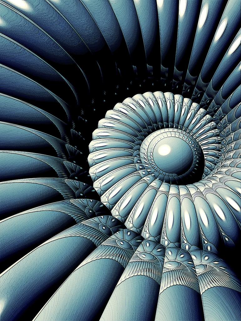This three dimensional digital artwork features a spiraling geometric sets of rings in a repetitive pattern, with a modern, futuristic aesthetic.