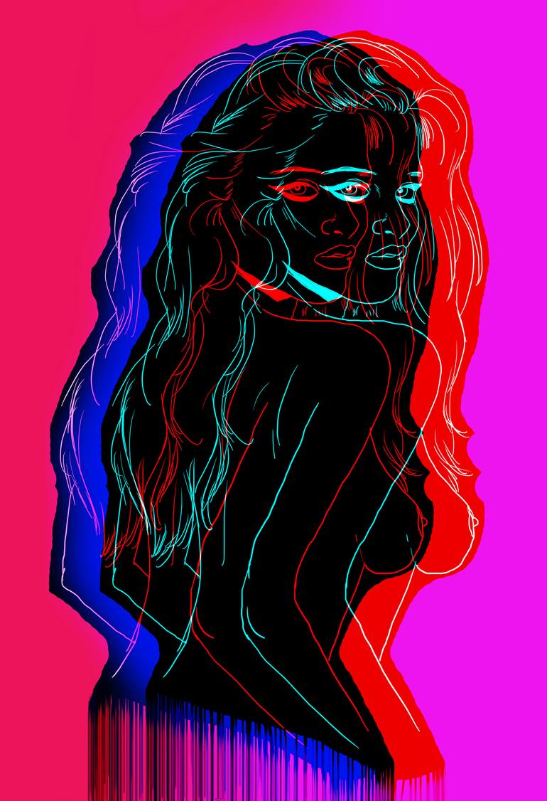 Digital drawing from my series of dark, fetish erotica, but with one exception: it is not black and white with occasional splashes of red, but digitally manipulated, bathed in neon colors.
