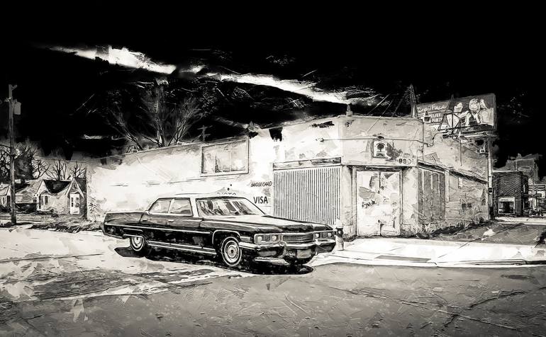 Our 1973 Cadillac Sedan deVille is cruising the inner city again. Night time on the rough edges of Detroit City. Composite of several images, blended and hand colored. Limited edition of 30 prints available as a signed 24x36 canvas gallery wrap in a black float frame with a Certificate of Authen...