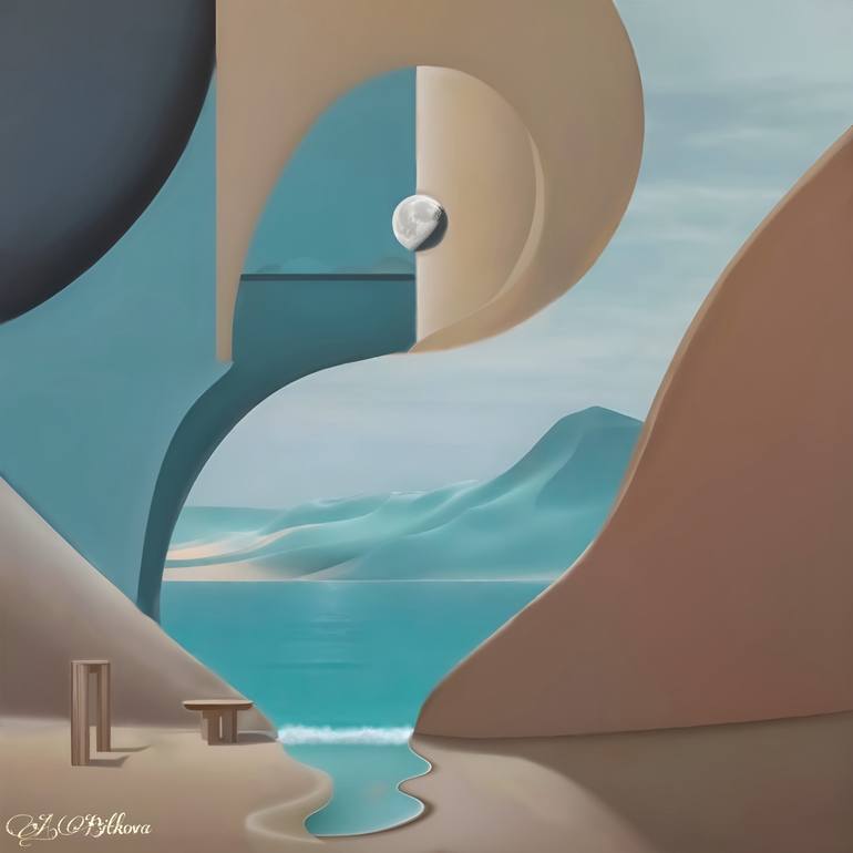 This serene painting, "Oasis of Mind" provides a sanctuary for the mind to wander and explore. Its surrealism and dream-like quality invite the viewer to meditate, allowing ample space for imagination and thought. The abstract and surreal elements of the painting create a sense of otherwoldliness, d...