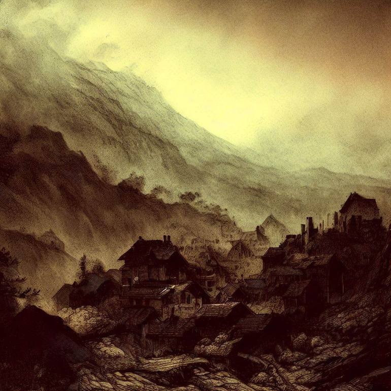 A thematic AI generated image in lithogravure style, capturing again the spirit of small villages in very picturesque and exquisite renditions, in both black & white and fading colors patterns. Part 5 of a new series of 10 under this theme.