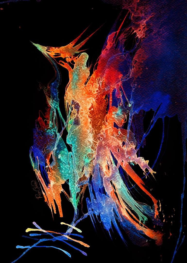 ֎ "Phoenix. Nocturno" by Rina Garon In my artwork, I aimed to capture the essence of the phoenix, a mythical bird that appears in numerous cultural stories. The phoenix is often depicted as a majestic creature with vibrant, flame-colored feathers in shades of purple, orange, and gold, along with a s...