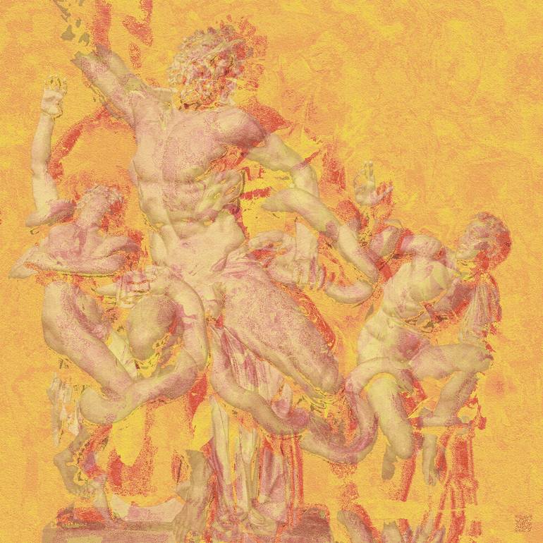 This work is part of the Memories Project. In the hues of fiery orange and crimson, a mnemonic reinterpretation of the iconic Laocoon statue emerges. Giclée print on Hahnemühle German Etching fine art paper.