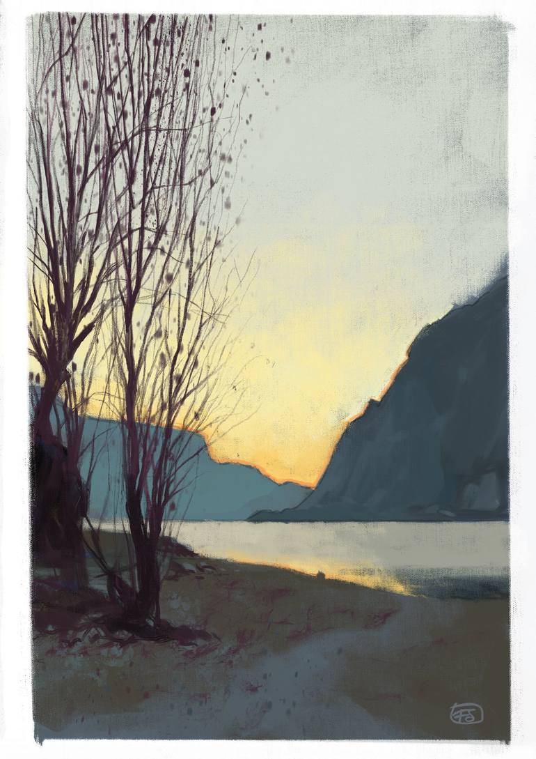 A view of Lake of Como, looking toward Lecco in a cold winter morning. I was inspired by the yellowish tones that light up with the bluish tones of the mountains that are reflected in the calm waters of the lake.