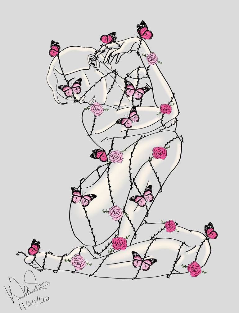 This is part of the "Thorns and Flowers" collection. Through my studies in figure drawing, I explored my ideas and deepened the meaning behind their gestures. The thorns portray hurt and frustration. In contrast, the pink theme, flowers and butterflies, represent gentleness and beauty. "We may feel ...