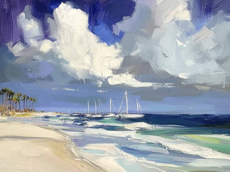 The painting depicts a beach scene. The painting is done in a realistic style using loose brushstrokes and bright colors. The sky is filled with large fluffy white clouds scattered across the sky. The clouds are a mixture of blue, white and gray, creating a dramatic and moody atmosphere. In the for...